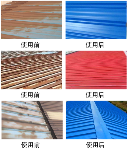 近年来随着经济的高速发展,在工业厂房民用建筑领域钢结构彩钢房大量生产和使用,使得屋面彩钢瓦的用量连年递增。 使用的用户多了,根据不同地区的天气情况,彩钢瓦不可避免的会出现生锈、起皮、褪色、脱落等问题。经济实用型的解决方法就是给它翻新。 对生锈起皮的彩钢瓦表面进行打磨清理,确保屋面干净。 将屋面灰尘和铁锈整体冲洗,确保不影响涂层的附着力。 整体喷涂彩钢瓦定制耐防腐漆,使用彩钢瓦具有优异防腐性能。